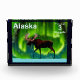 This is one of a series of postage stamps of a mythical independent Alaska. An ever so slightly stylized image of a moose silhouetted against the green and glowing Northern Lights. Text reading "Alaska" and "Postage 3 Nuggets" also appears.