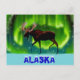 An ever so slightly stylized image of a moose silhouetted against the Northern Lights. The word "Alaska" appears at the bottom in a font suggestive of ice and snow.