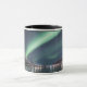 Landscape photograph of green Northern Lights (Aurora borealis) reflecting in a frozen fjord at the coast of North Norway, Scandinavia.