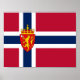 Stylized flag of Norway with the coat of arms superimposed and the name of the country on top - in Norwegian.