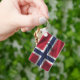 Keychain with the flag of Norway in wavy fabric style design. This design features the Norwegian flag colours and design with a beautiful waving material textured effect. This flag design is a great way to show you are proud to be from Norway.