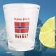 Snow-capped, red lettering, on this shot glass, reads NORWAY underneath this Norwegian Flag with a red background and dark blue Scandinavian, or Nordic, Cross. Above is a place to add your name, in red letters, to personalize your look. Or, add someone else's name for a gift for anyone of Norwegian ancestry. Wonderful housewarming gift for the home bar or stocking stuffer.