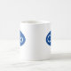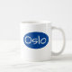 A blue and white mug that says Oslo on it with a unique font. Oslo is the capital city of Norway.