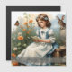 A young girl in a blue dress with white ruffles sits on a wooden bench in the middle of a flowering garden. She is reading a small card while butterflies fly around her. A hare and a small rabbit sit next to her, while other spring flowers bloom in warm colours in the background. The words "Happy Easter" give the picture a festive touch.
