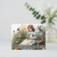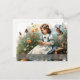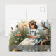 A young girl in a blue dress with white ruffles sits on a wooden bench in the middle of a flowering garden. She is reading a small card while butterflies fly around her. A hare and a small rabbit sit next to her, while other spring flowers bloom in warm colours in the background. The words "Happy Easter" give the picture a festive touch.