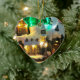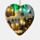 This lovely colourful old fashioned heart shaped Christmas tree ornament features a nostalgic scene of an illuminated mountain church, against a snowy background.