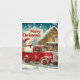This charming winter scene features a red vintage truck carrying a cheerful snowman in the back. The truck, adorned with a snowflake decoration on the door, is covered in a blanket of snow. In the background, a wooden house with a snow-covered roof and icicles hanging from the eaves adds to the festive atmosphere. Snowflakes gently fall from a sky filled with blue and white clouds, while the text 'Merry Christmas' is prominently displayed in red letters, capturing the essence of a traditional and nostalgic holiday celebration.
