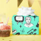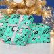 Birthday or Anniversary fifties themed gift wrap with graphics of vinyl albums, musical notes, a couple dancing, milkshakes, drive in sign, tvs hotdogs and other fun retro images. Black and white with a teal background.