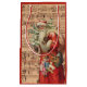 Nostalgic Santa in long red coat carrying a snow covered small evergreen tree along with lots of toys. Behind is a piece of sheet music. Other matching items available