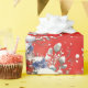 Nostalgic festive wrapping paper with a pattern of birds and snowy branches on a bright red background.