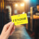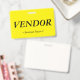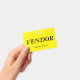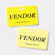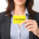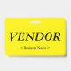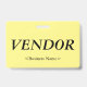 This traditional badge design features the message "VENDOR", and a customizable company name or other custom message. A badge like this could perhaps be used to indicate that a person is a known and authorized guest or visitor at a business or workplace. [~Z0000307]