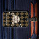 A nostalgic vintage steampunk fantasy man in the moon design with a harlequin checked background. In antique sepia tones. Personalize with your name or give as a gift.