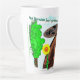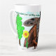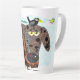 This latte mug is for laughs and fun, it's about a brown spotted cartoon dog who claims not to be bored on a warm summer day, instead the dog is getting creative. The dog is brown with black spots and has a large black nose it is summer time so the sun is shining brightly flowers are in bloom trees are green an there even is a tiny bird sitting on the dogs head.