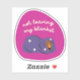 Feeling like the world has you down? Tough day? Want to stay in your blanket? This sticker has you covered—pun intended! Perfect for dog fans, journalers, people who understand that sometimes you just want to say, "not leaving my blanket." This sticker gives you the courage to face the world—tomorrow. The shape, text and colours give a mid-century vibe. Magenta background colour, purple blanket, and a brown dog.