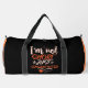 This black duffle bag features a humourous and empowering message in stylized white and orange text: "I'm not SHORT just CONCENTRATED." This design is perfect for those with a great sense of humour about their height. Edit colour of the bag caps and body in the Design tool to your favored colours.