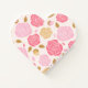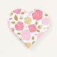 This notebook is shown in a cute heart shape with lined pages in a pink and gold roses print design on a white colour background.