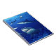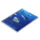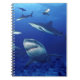 Notebook shown with a photo print of sharks in the deep sea. Customize this item or buy as is. Stock Image