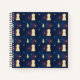 A spiral notebook, with a starry night pattern. Featuring red and blue lights, knives, and keyholes on a dark blue (navy) background.