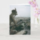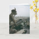 Gargoyle atop Notre Dame in Paris, France. Seine river and Eiffel Tower in the background.