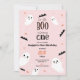 Notre petit Boo en tourne un ! Jolie invitation à la fête d'anniversaire d'Halloween pour votre petit jour spécial. Le design moderne présente une belle texture rose douce arrière - plan avec de petits fantômes, des chauves-souris, des feuilles et des illustrations citrouilles. Personnalisez avec vos informations.