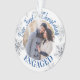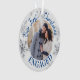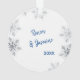 Notre premier ornement photo personnalisé de Noël Engaged, avec typographie bleue et flocons de neige argentés. Le modèle photo est configuré pour vous pour ajouter une de vos photos préférées et vous pouvez aussi ajouter vos noms et l'année à l'arrière.