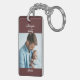 Porte - clé photo pour la première fête des pères d'un nouveau papa. Le modèle photo est configuré pour ajouter 2 de vos photos préférées, qui sont imprimées de chaque côté, en format carré / instagram. Le libellé est entièrement modifiable et se lit actuellement "notre première fête des pères [année] je vous aime papa [nom]". Il a une palette de couleurs simple et moderne de brun foncé et blanc avec une typographie de script audacieuse et rétro.