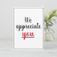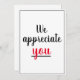 Une carte décontractée "Nous vous apprécions". Carte d'appréciation rouge et noir que vous pouvez rendre personnel avec un beau geste de la part du patron, collègue ou n'importe qui. Il vous suffit d'utiliser la fonction "personnaliser ce modèle" pour modifier le texte afin de le rendre le vôtre. Autres styles de papier disponibles.