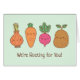 Légumes mignons gribouillis d'oignon, de carottes, de radis et de pommes de terre avec une légende de jeu de mots "Nous vous racontons !" L'intérieur de la carte dit "Bonne chance ! ♥" Un doodle pour encourager, soutenir et soulager quelqu'un de sa journée!