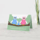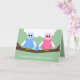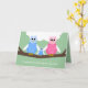 Cette adorable nouvelle carte de félicitations pour bébé garçon présente une jolie petite famille de hibou assise sur une branche d'arbre avec maman et papa hibou qui met les bras autour de la chouette bébé. Vous pouvez customiser le dessin avec le nom des nouveaux parents. À l'intérieur de la carte, il y a un joli couplet de félicitations. Copyright Kathy Henis