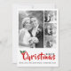 Nouveaux mariés premier Noël vacances photo collage avec 4 cartes photos mariages. Le texte "Noël Marié" dans un script de typographie moderne lettrée à la main en rouge et noir, baies sainte et 4 photos ornent cette carte plate contemporaine. Un motif rayé rouge et vert couvre le dos.