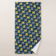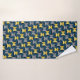 Ce set de serviettes a un design moderne du milieu du siècle des ovales dans la marine avec des demi-cercles dans les tons jaune et gris dans eux sur un champ de noir.