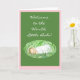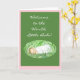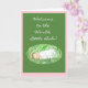 Une carte de bienvenue pour une nouvelle petite fille, avec un bébé endormi et des lettres blanches sur un arrière - plan vert foncé, bordée de bleu.