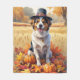 A watercolor-style painting of a cheerful dog sitting amidst a pile of vibrant fall leaves, surrounded by tiny pumpkins and scattered acorns. The dog wears a little pilgrim hat and beams with joy, capturing the spirit of Thanksgiving. In the background, soft harvest fields and golden-hued trees create a peaceful countryside ambiance. Gentle textures and warm, muted autumn tones give the scene a cozy, nostalgic feel perfect for celebrating the beauty of the season.