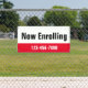 This outdoor banner is bright red, black, and white. You can edit the text to meet your needs. You can add your custom message (shown: Now Enrolling) and phone number. The top is white with black text. The bottom is bright red with white text for your phone number or custom text. All text can be edited or deleted.