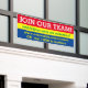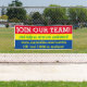 Your choice of noticeable colour scheme on this "now hiring" "help wanted" or "join our team" banner to hang in your business to get the attention of those actually looking for a job instead of sitting around collecting stimulus dough, personalized with your text.