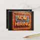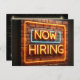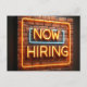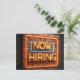 A neon sign with "NOW HIRING" text is mounted at an angle on a brick wall glowing with a bright orange lighting.