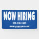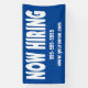 Now Hiring sign banner in white on blue background (or change the background colour if you like) for attention getting notice that your business is offering employment. Now available in smaller size for window or small display area. Edit the information lines to add your own contact info or other text.