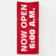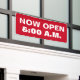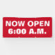 Grow your business with this Now Open Custom Time Business Banner. It is designed with a customizable red background and large bold minimal lettering. The text is "now open" followed by customized time and you can change the words if needed by clicking the personalize template option. Available in different sizes.