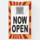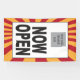 Now Open sign for new business.. Replace the image placeholder graphic with your logo or business name. Attention getting red and orange sunburst rays border will draw the eye of potential customers.