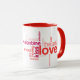 La tasse fraîche de Saint-Valentin avec le nuage rouge d'étiquette des textes formé de l'amour a rapporté des mots. Vous pouvez facilement customiser votre nom d'amoureux ou tout autre texte court au nuage ou laisser le blanc de champ si vous aimez. Essai avec différents styles et couleurs de tasse !