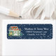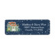Une maison colorée fantaisiste avec des couronnes de Noël sur la porte et des pins autour. Des flocons de neige bordent le étiquette. Le joli arrière - plan de soirée bleu marine donne une sensation d'hiver au étiquette. Personnalisez ces étiquettes de adresse pour vos cartes de fin de année et vos invitations. Ils ajoutent une touche festive à vos enveloppes.