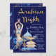 Invitations de soirées arabes avec de belles illustrations bleues et or sur un arrière - plan bleu royal. Cette magnifique fête d'anniversaire et invitation à l'événement Arabian Night est facilement customisée pour votre événement en ajoutant simplement vos détails. Vous pouvez également modifier la couleur de l'arrière - plan. Il s'agit d'un dessin imprimé sans parties scintillant réelle, feuille, etc.