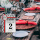 Pancartes de table de mariage à motif damassé à cœur noir et blanc avec garniture rouge