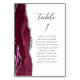 Le bord gauche de cette élégante carte de numéro de table mariage moderne comporte une bordure d'aquarelle rouge bordeaux et ornée d'une parties scintillant en faux argent. Le mot "table" apparaît dans le script d'écriture manuscrite gris charbon sur un arrière - plan blanc. Ajoutez les noms de vos invités qui sont affectés à chaque table.
