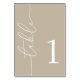 Notre design simple et moderne de numéro de table fait partie de notre collection Stork; avec des teintes brun doré et sans serif et la typographie cursive manuscrite.