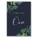Design de typographie moderne et élégant, carte de numéro de table bleu marine. La carte présente une aquarelle rustique feuillage forestier dans les tons vert et bleu. Lors de la commande de cartes numériques de table, chaque carte doit être numérotée et commandée individuellement.