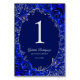 Cartes de numéro de table de célébration Quinceanera bleu royal argent. Caractéristiques, police de script, papillons argentés pailletés, roses aquarelles et diadème. Parfait pour une célébration de glamour de style princesse élégante. Personnalisez avec vos propres détails. Invitations Zazzle imprimées ou modèle numérique téléchargeable instantanément.