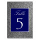 Faites briller votre réception avec cette élégante carte de numéro de table argent et bleu royal. Dotée d'un fond bleu royal audacieux avec une écriture élégante et une bordure argentée de style pailleté, ce modèle de numéro de table ajoute une touche de luxe à votre décoration de mariage. Parfait pour les célébrations glamour, modernes ou festives, il guide sans effort vos invités à leurs sièges avec une sophistication chic. Associez-la à des accents bleu royal et argent assortis pour un look cohérent époustouflant.