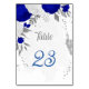 Romantique bleu royal & fleurs blanches avec carte de numéro de table de mariage botanique feuille argent. Les détails de la parties scintillant sont simulés.