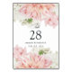 Cartes de numéro de table de mariage rose et blanc. Vous y trouverez des dahlias, des chrysanthèmes et des roses.